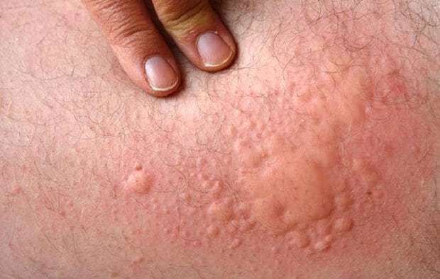 - при осмотре – кожные покровы пациента в месте контакта с аллергеном ярко-красные, покрыты мелким волдырями, в более позднем периоде может наблюдаться шелушение. Нередко поражение кожи выявляется в виде характерных очагов – кожа пострадавшего покрыта большими пятнами с неправильными очертаниями, которые могут сливаться между собой. В ряде случаев определяется реакция уртикарного типа – множественные волдыри на фоне покраснения, которые сливаются между собой (картина напоминает состояние кожи после воздействия на нее крапивой);