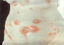 Через какое-то время бляшки сливаются между собой в один конгломерат, диаметр которого может достигать 10-12 см. Если корки отслаиваются, то после заживления язвенной поверхности бляшек остаются рубцы и зоны атрофии.