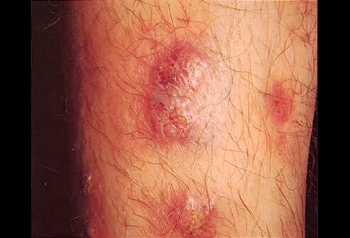 Нередко и пустулы, и узелки воспаляются, при этом их окружает характерная красная каемка. Далее они могут вскрываться, после чего на их месте образуются рубцы, которые имеют характерную синюшно-багровую окраску.