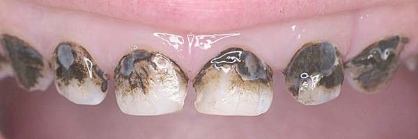 Для бутылочного кариеса типично постепенное развитие. Вначале имеет место деминерализация эмалевого слоя, затем – разрушение эмали и поражение эмалево-дентинной границы. Если своевременно не приять адекватные меры, развивается глубокое поражение твердых структур зубной единицы.