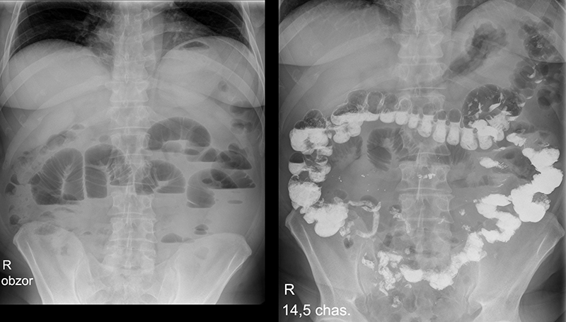 - рентгенография пассажа бария по тонкому кишечнику – больному предлагают выпить порцию сульфата бария и через полчаса проводят рентгеноскопию и -графию кишечника. Во время исследования можно выявить участки спазма подвздошной кишки и нарушение пассажа (перемещения) сульфата бария – замедленное опорожнение подвздошной кишки от контрастного вещества. В тяжелых случаях возможны признаки динамической (из-за нарушения моторики кишки) кишечной непроходимости – в частности, отсутствие пассажа бария;