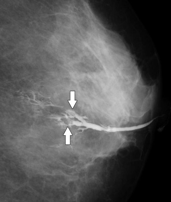 - дуктография – рентгенологическое исследование молочных желез, во время которого в их протоки вводят контрастное вещество, а затем делают рентгенологические снимки;