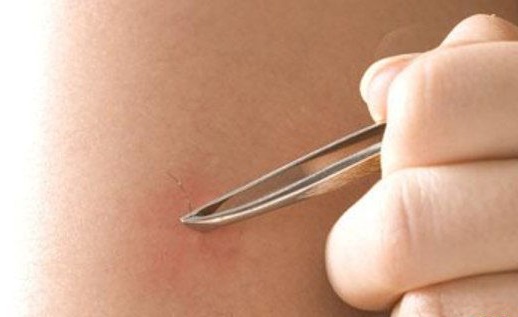 - На зону удаления предварительно накладывают слегка подогретый компресс, чтобы распарить кожный покров и облегчить проникновение через него инородных предметов, затем волос подцепляется щипчиками или пинцетом и аккуратно вынимается. В том случае, если он находится под верхним слоем эпидермиса, то кожу осторожно прокалывают иглой, подцепляют волосяной стебель и выводят его наружу для удаления. После проведения процедуры место врастания снова тщательно обрабатывают антисептиком;
