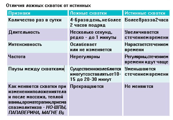 Истинные схватки имеют равные промежутки между схватками, не устраняются за счет ванны и отдыха, нарастают по интенсивности ощущений и продолжительности. Стоит их отличать от ноющих болей в спине или животе из-за положения плода в матке и нагрузок на поясницу, растяжения связок и расхождения костей таза в области лонного сочленения. Могут быть ноющие слабые боли в области поясницы, тазу и животе, опоясывающие по характеру. При этом напряжения как таковых мышц матки нет, живот достаточно мягкий.