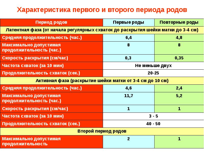 Во вторых и последующих родах интервалы разделены таким же образом, но длительность их короче, а сами схватки более сильные и продуктивные.