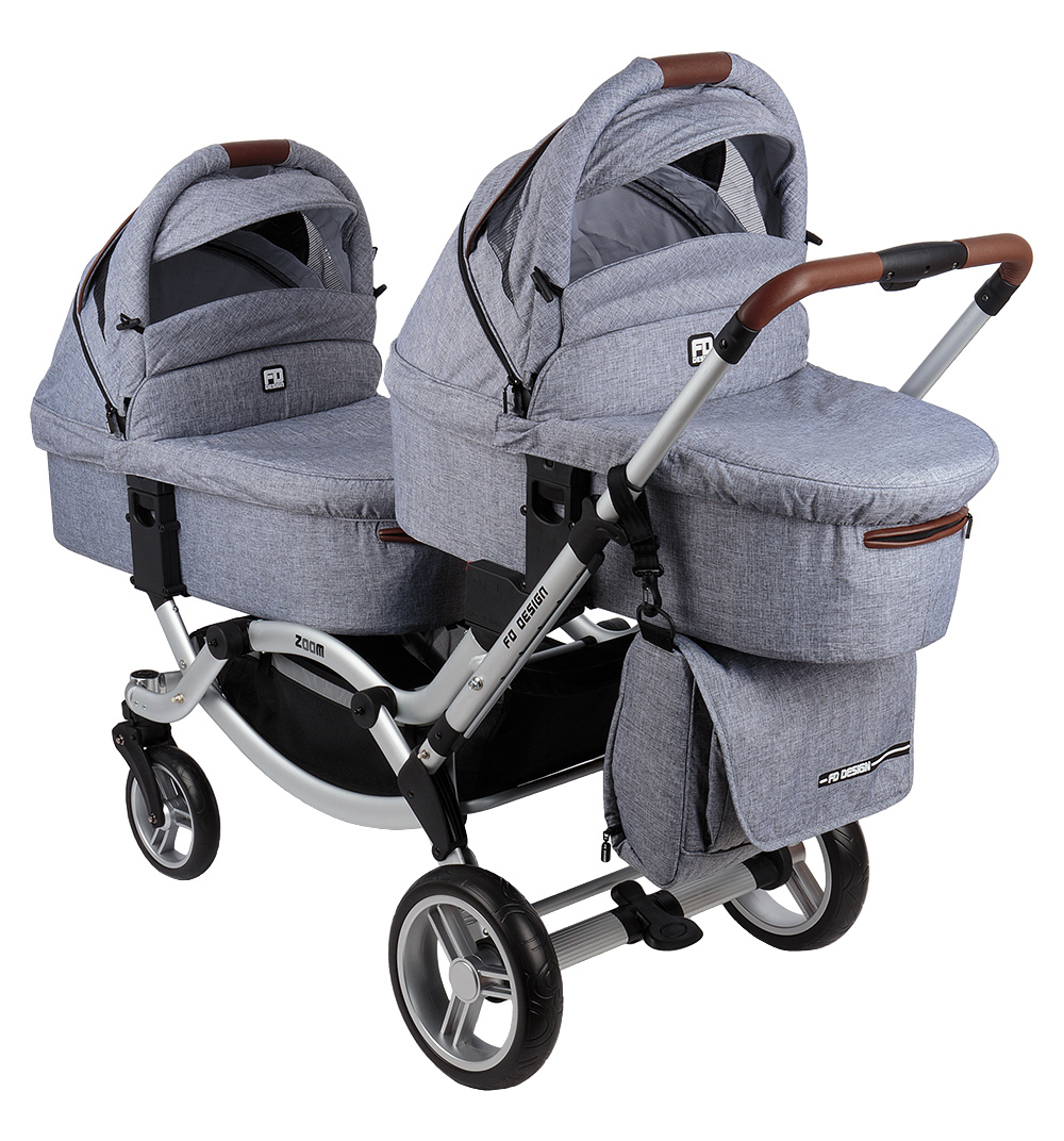 - Коляска «Паровозик». В данном варианте люльки размещены друг за другом, придавая вытянутость конструкции, при этом ширина остается на уровне стандартной коляски. В подобных транспортных средствах дети могут быть расположены в одном из следующих положений по отношению друг к другу: спина к спине, лицо к лицу, непосредственно друг за другом, лицом или спиной (в прогулочном варианте) к маме. Кроме того, по высоте люльки могут находиться как на одном уровне, так и на разных. К преимуществам подобной модели можно отнести хорошую управляемость и маневренность, а также возможность воспользоваться многими лифтовыми кабинками. Минусы: сложности с разворачиванием транспорта и заездом на бордюр, а также возможные споры подросших детей, кто будет ехать впереди, а кто сзади. Среди популярных моделей «паровозиков» можно выделить: Peg-Perego Duette SW, iCandy Peach Blossom Twin, FD-Design (Zoom).