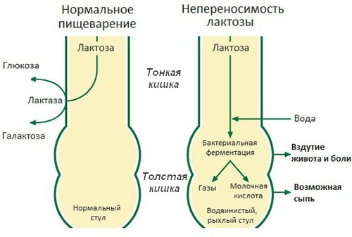 Симптомы формируются в силу нарушений, связанных с расщеплением молочного сахара, происходящим внутри тонкого кишечника, а также проблем с всасыванием избытка жидкости в области толстой кишки формируется диарея.