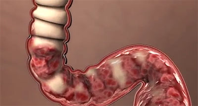 - при инвазивной диффузном поражении кишечника будут выявлены небольшие множественные язвы и некротически измененные участки слизистой оболочки кишечника.