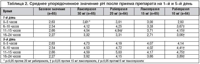 Степень антисекреторного эффекта лансопразола в 2, 4 раза выше, чем у омепразола, поэтому лансопразол обладает более мощным свойством подавления желудочной секреции [17]. И, что особенно важно, минимальная ингибирующая Нр концентрация лансопразола (6, 25 мг/л) значительно меньше, чем у омепразола (50, 0 мг/л).