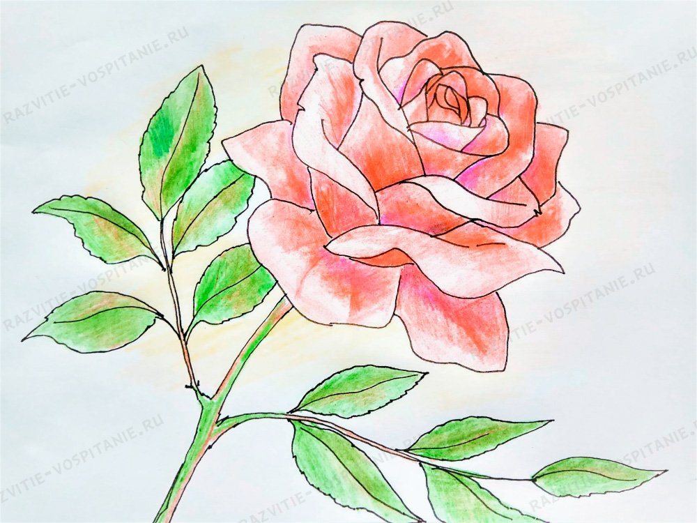 Совет. Для дошкольников и учащихся 1-го класса подойдет более легкий вариант. Достаточно будет закрасить розу в светлый цвет и обвести более темным карандашом по контуру. Интересный результат получится, если сочетать разные оттенки синего, красного, фиолетового, оранжевого.
