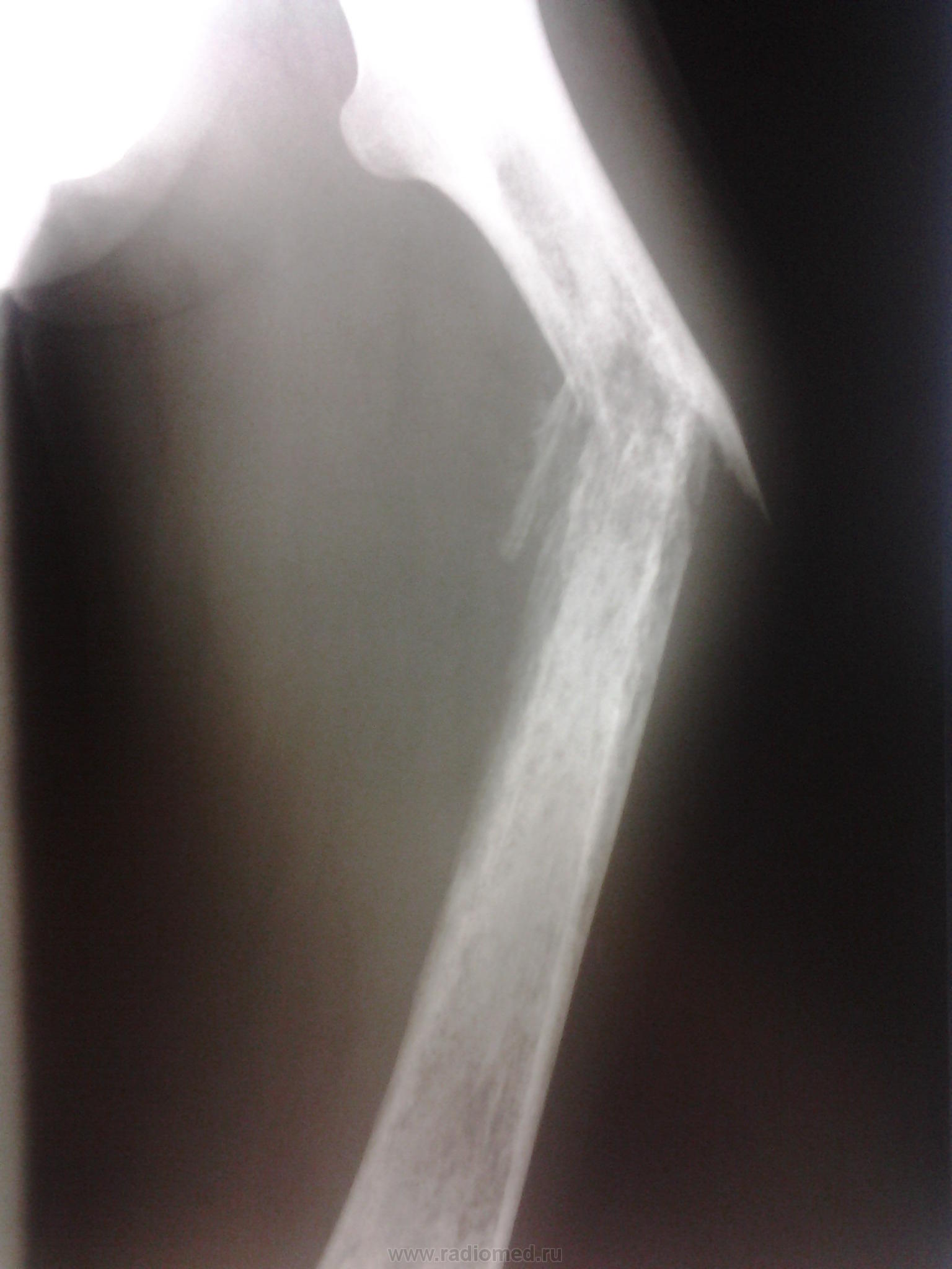 - патологический перелом – дефект костной ткани в месте ее «разъедания» опухолью, который появляется без травматической провокации, а только из-за того, что бедренная кость в силу своего расположения вынуждена «держать» на себе туловище;
