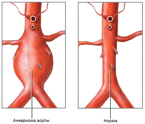 - аневризма аорты – выпячивание стенки этого сосуда в виде мешочка (чаще всего наблюдаются аневризмы брюшного отдела аорты);