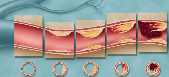 - атеросклероз – образование жировых бляшек на внутренней поверхности сосуда;