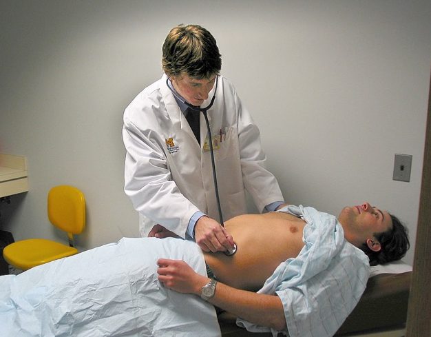 - при пальпации (прощупывании) живота тоже выявляется несоответствие ее результатов общему состоянию – в первые часы живот остается мягким, болезненность совсем незначительная. Симптомы раздражения брюшины отсутствуют;