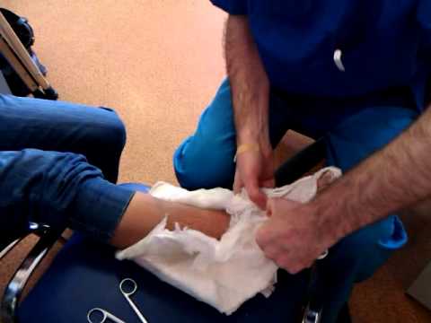 Приложить холод к стопе. Раны обработать антисептиком, наложить стерильную повязку. Зафиксировать конечность при помощи досок, фанеры. Сустав нужно фиксировать выше и ниже места перелома.