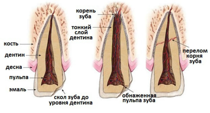 - перелом дентина с обнажением сосудисто-нервного пучка (пульпы);