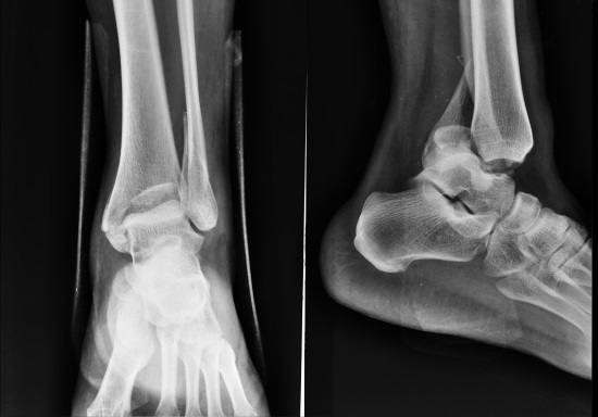 - рентгенологическое обследование ‒ рентгенологические снимки делают в прямой и боковой проекциях (иногда ‒ в косой при необходимости проведения дифференциальной диагностики подвывиха голеностопного сустава с другими типами его повреждений). С помощью рентгенологических снимков оценивают степень смещения суставных поверхностей костей;