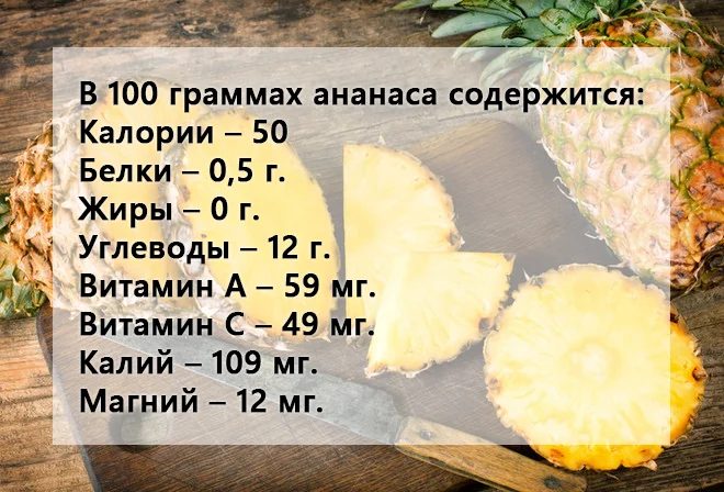 Ананас — низкокалорийный фрукт, в 100 г которого содержится всего 52 ккал. Он богат витаминами группы В, витаминами С, Е, А, а также микроэлементами и минералами, такими как калий, магний, цинк, медь, селен и кальций. В ананасе содержатся пищевые волокна, пектины, антиоксиданты, биофлавоноиды и растительные ферменты.