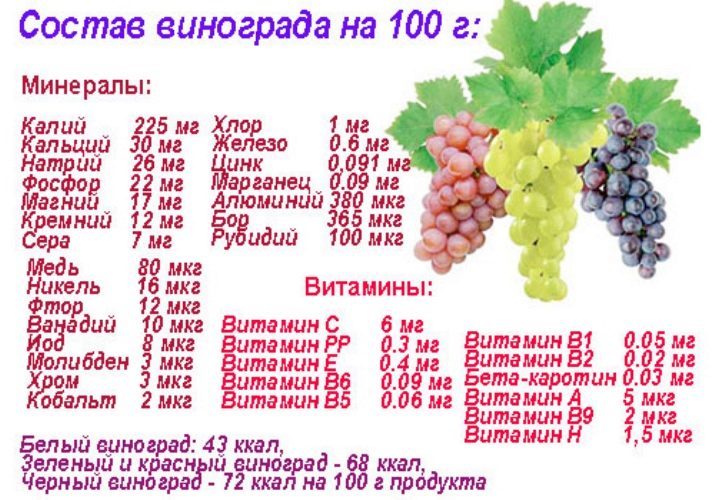 Виноград содержит массу витаминов, минералов и органических кислот. Он улучшает состав желудочного сока, положительно влияет на работу пищеварения, повышает аппетит и в целом полезен для здоровья. Это очень питательный продукт, поэтому виноград нередко называют растительным молоком.