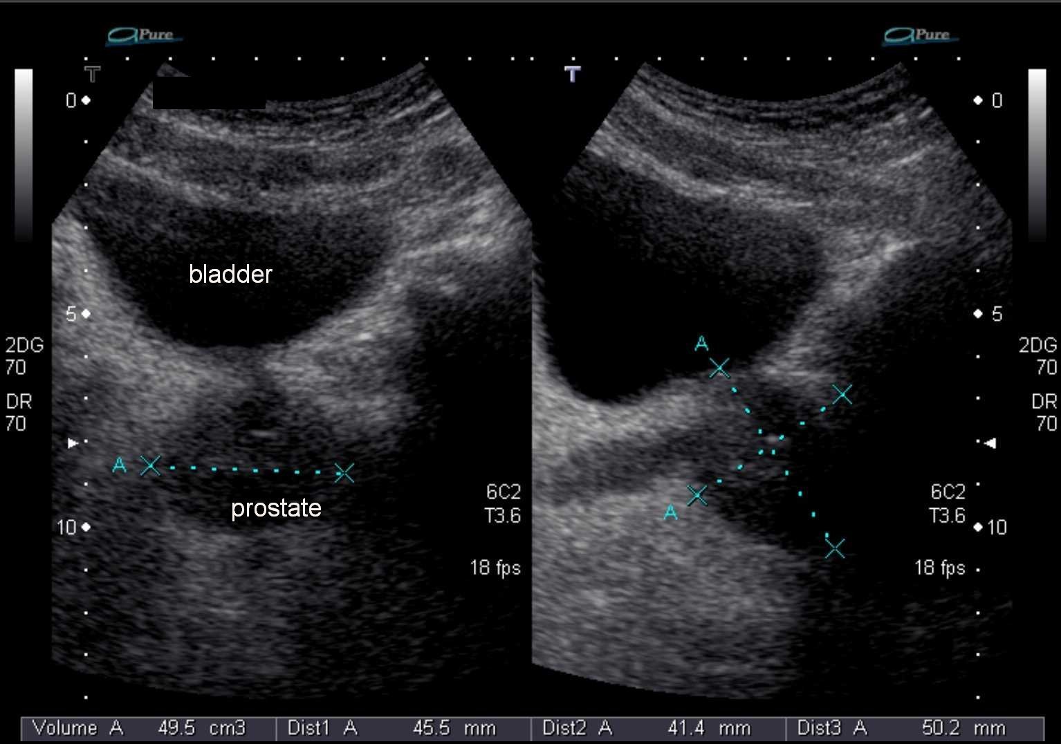 Если выбирать между абдоминальным УЗИ и трансректальным — последнее более предпочтительно, так как визуализация паренхимы простаты значительно лучше. Но для полноты картины в некоторых случаях трансабдоминальное УЗИ на фоне тугого наполнения жидкостью мочевого пузыря должно быть выполнено, так как метод дает представление о степени увеличения простаты, внутрипузырном росте опухоли и деформации шейки пузыря.