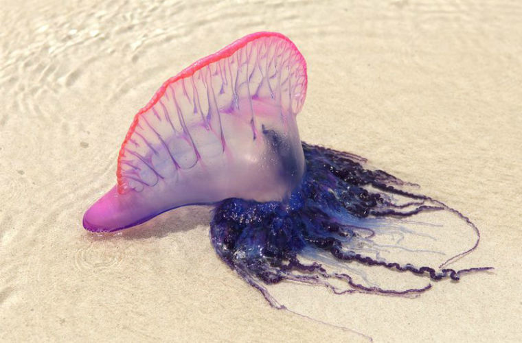 Физалия или Португальский кораблик – это не совсем медуза, но за схожесть ее отнесли к этой группе. Укусы этой забавной колонии медузоподобных очень болезненны, обычно они держатся стаями, из-за чего порой приходится закрывать пляжи. Типично обитание в тропических морях, в умеренных широтах – редкие гости.