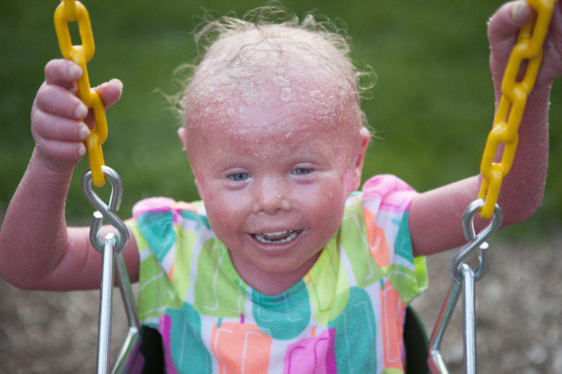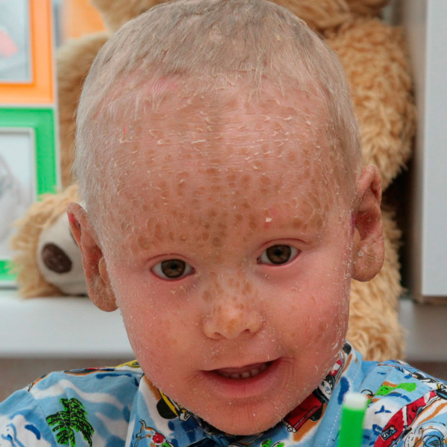 Первые признаки заболевания чаще всего проявляются в возрасте от 3 месяцев до 3 лет. Диагностируется диффузное (широко распространенное) поражение кожного покрова в виде чешуек, которые образуют пласты различной степени выраженности (сама кожа при этом остается неизмененной). Самое легкое проявление – образование легких чешуек, которые имеют телесную окраску. При тяжелой степени развития патологии образуются массивные чешуйчатые скопления со следующими характеристиками:
