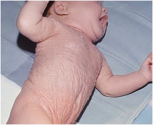 - ихтиоз новорожденных (коллоидный плод) – ребенок рождается в пленке коричневого цвета, которая высыхает и трескается. Кожа такого ребенка теряет защитные свойства, поэтому нередко возникают ее инфекционно-воспалительные болезни (в то числе и гнойные);