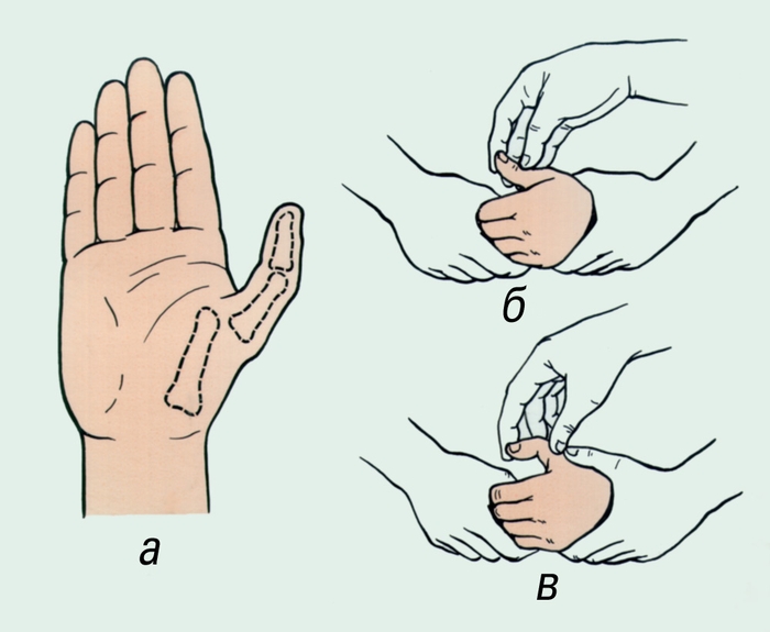 Когда при вывихе I пальца оказывается защемленным сухожилие, то проводят его поворот в локтевую сторону с параллельным сгибанием ногтевой фаланги.